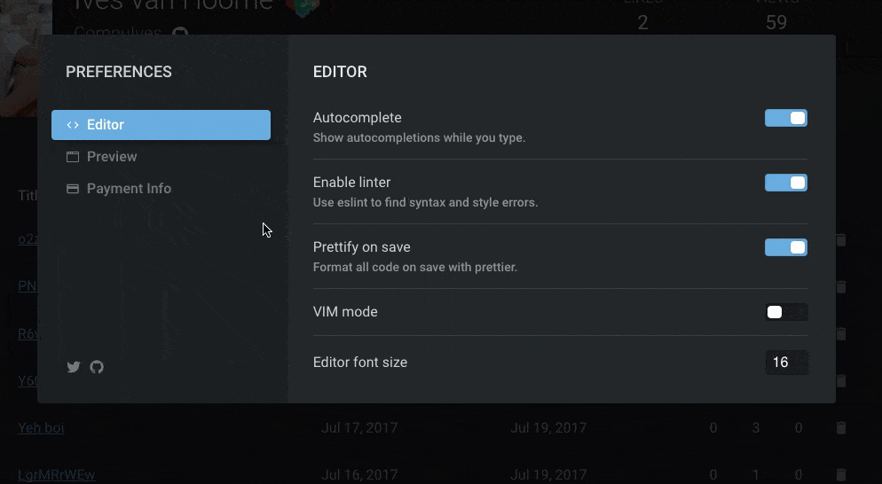 This opens up the possibility to have advanced preferences, like ESLint config, custom Prettier config and customized theming. We will also include more preferences. The design of the preferences modal is inspired by Discord and Stripe.