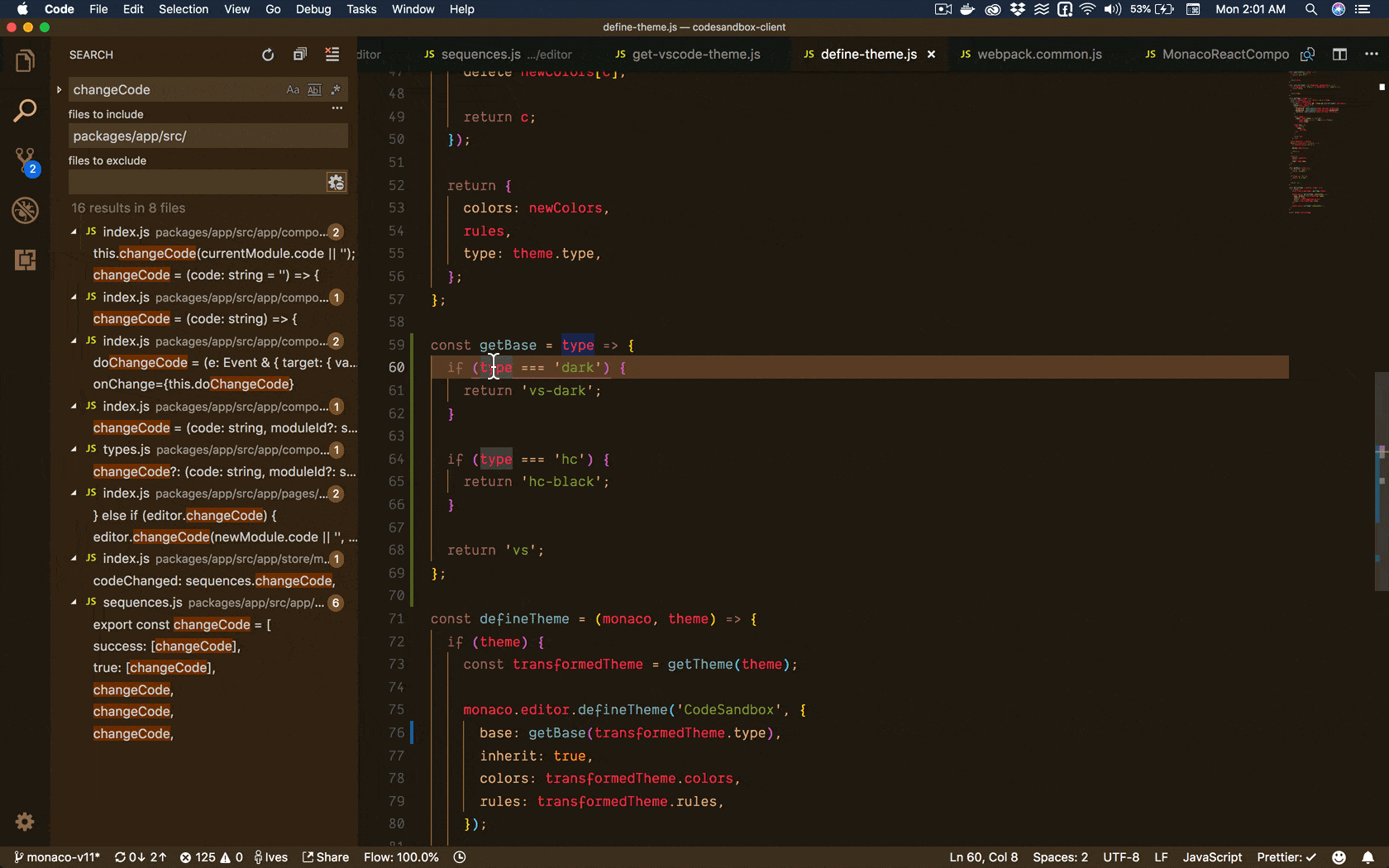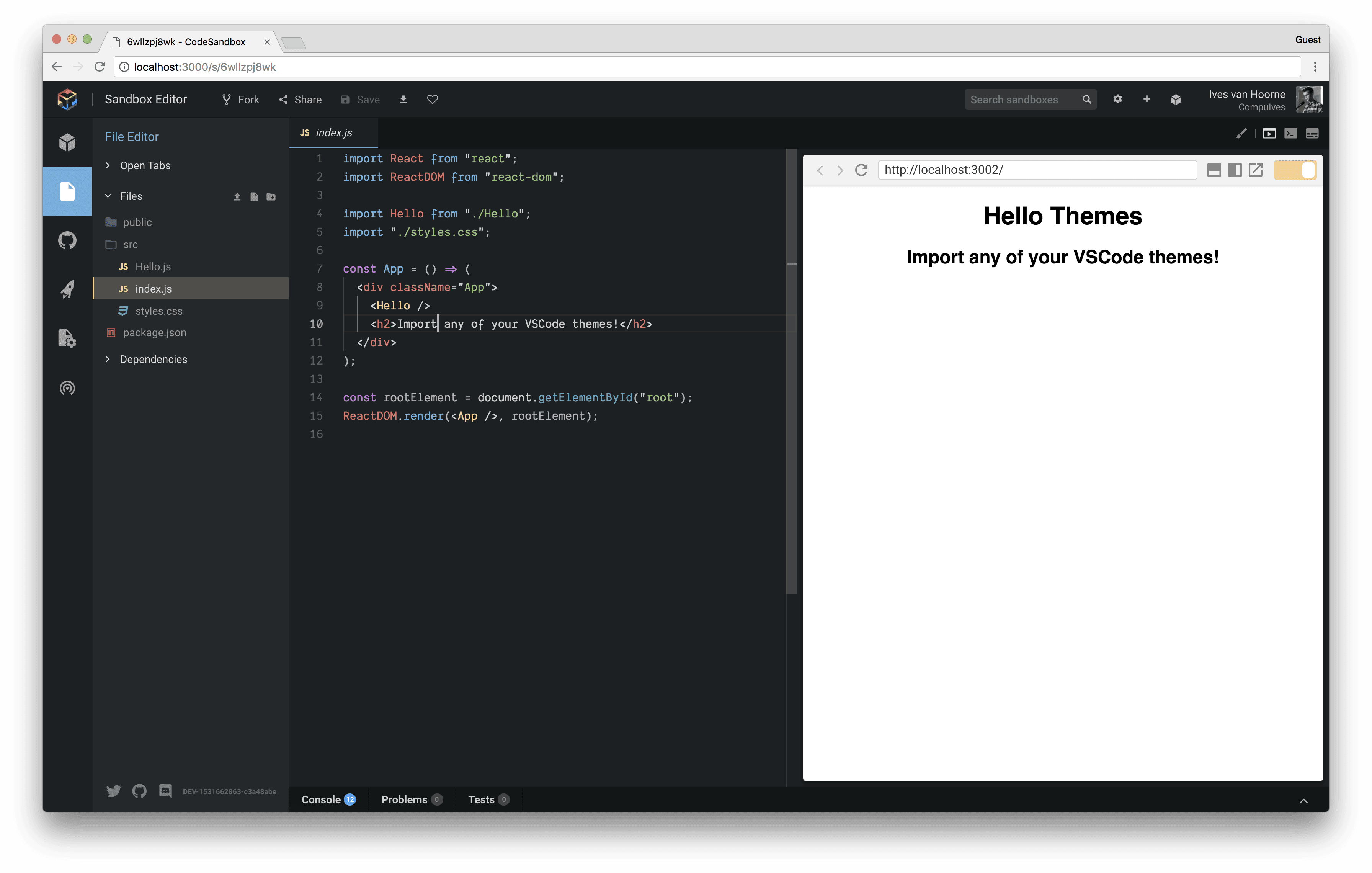 CodeSandbox didn't have any way to personalize colors in the editor since release, but I'm happy to announce that we do now. The best part is that we were able to reuse a big chunk of logic from VS Code directly and thus we support any VS Code theme natively in CodeSandbox!