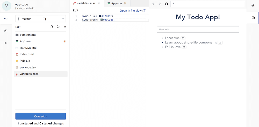 GitLab has a web editor that allows you to write code in the browser and directly commit to GitLab. Gitlab is using Sandpack to execute the code of frontend projects so you can see the live results:
