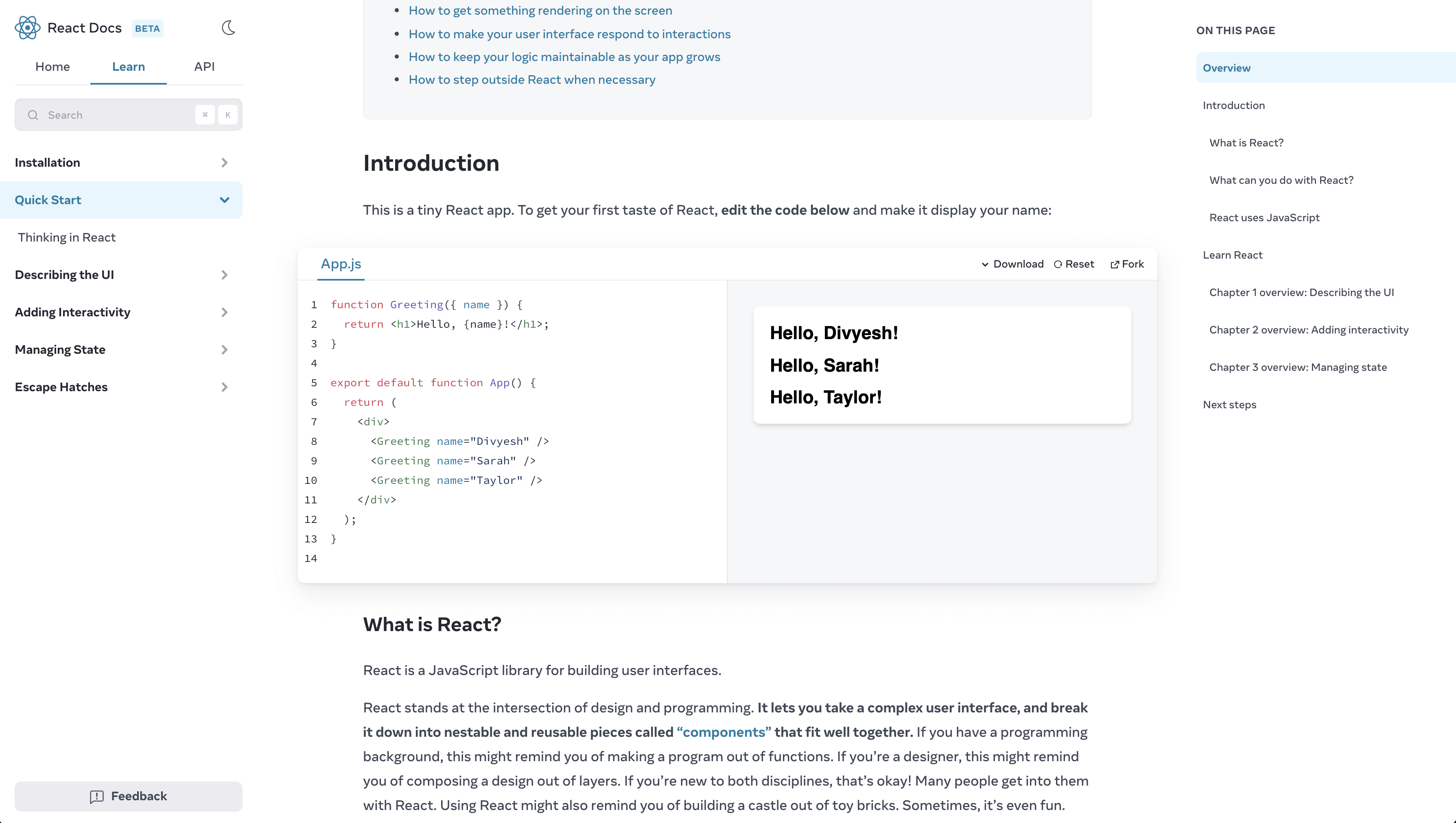 The new React Docs is using Sandpack for its examples and for the challenges. The React team wanted to fully style and customize Sandpack for their new website, and with Sandpack they were able to customize everything. From the editor to how errors are shown: